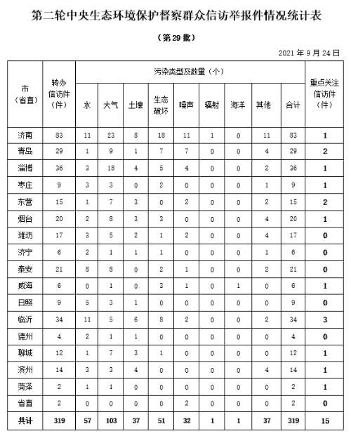 9月24日,中央第二生态环境保护督察组向我省转办信访件319件(重点关注件15件),其中来电75件,来信244件。本批信访件涉及济南市83件、青岛市29件、淄博市36件、枣庄市9件、东营市15件、烟台市20件、潍坊市17件、济宁市6件、泰安市21件、威海市6件、日照市9件、临沂市34件、德州市4件、聊城市12件、滨州市14件、菏泽市2件、省直部门2件。当日,上述信访件全部交办各市和省直部门。按照中央第二生态环境保护督察组的要求,信访举报件的办理情况须在10天内反馈到督察组,整改和处理情况将及时向社会公开。